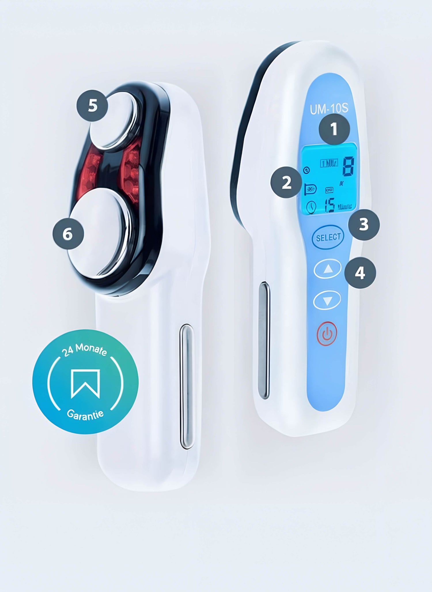 Zur einfachen Bedienung und Regulierung der Schallintensität. Je Schallkopf 1 - 8 Intensitätsstufen möglich für eine individuelle Anwendung für jeden Hauttyp.